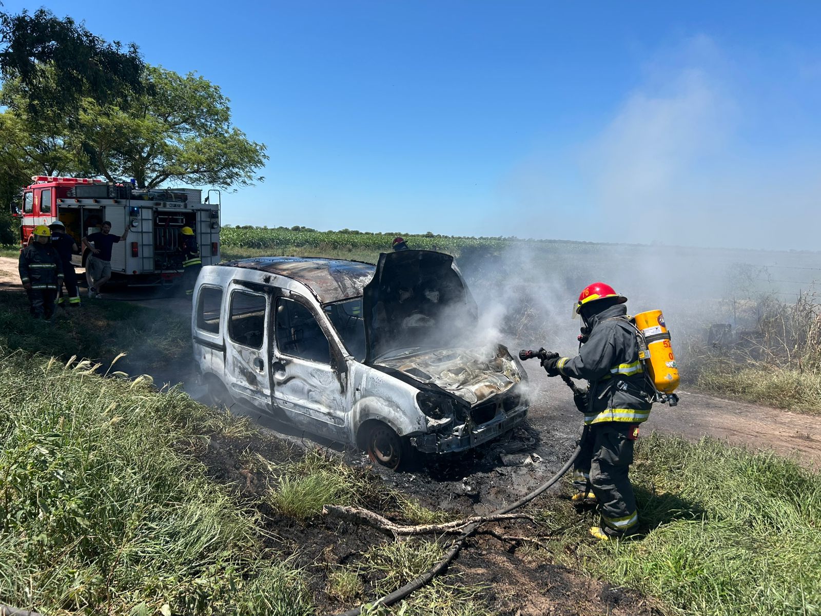 Un vehículo se quemó por completo cerca de las 12 hs de este domingo en zona rural de Colonia Vignaud Dos dotaciones (Unidad de rápida intervención U21 y Unidad pesada U19), con 8 bomberos de Brinkmann a cargo del Jefe Inspector Nicolas Varesio sofocaron las llamas y enfriaron el vehículo pero no pudieron evitar los importantes daños. Se investigan las causas del incendio.