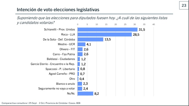 El trabajo, que se realizó con entrevistas domiciliarias, sobre más de 800 casos, muestra en tercer lugar, con 13,5%, a Natalia de la Sota de Defendamos Córdoba. Cuarto, con 4,1%, Ramón Mestre de la UCR. En quinto lugar, con 2,6%, las listas de Fuerza Patria, con Pablo Carro, y el FIT-U, con Liliana Olivero, 2,6%.