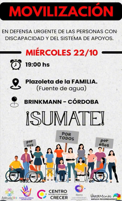 Este miércoles 22 de octubre a las 19 horas, se realizará en Brinkmann una movilización en defensa urgente de las personas con discapacidad y del sistema de apoyos.