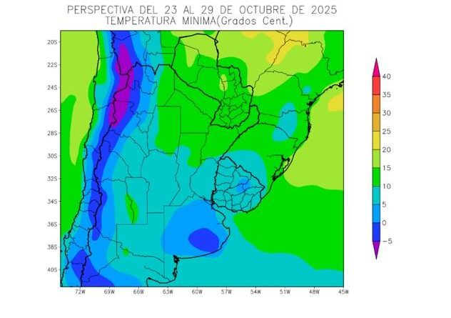 Perspectiva agroclimática: temperaturas mínimas durante la semana del 23  y 29 de octubre. (Gentileza Bolsa de Cereales de Buenos Aires)