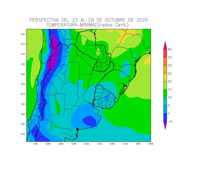 El centro del NOA, el este de Cuyo y la mayor parte de la Región Pampeana, en cambio, las mínimas quedaría por debajo de 10 °C, con registros inferiores hacia el este y el sur, y heladas localizadas y generales sobre las serranías de Buenos Aires.