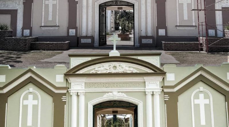 Realizamos la pintura completa de la fachada del Cementerio local, tras un trabajo previo de lavado de paredes para la remoción de hongos y adherencias.