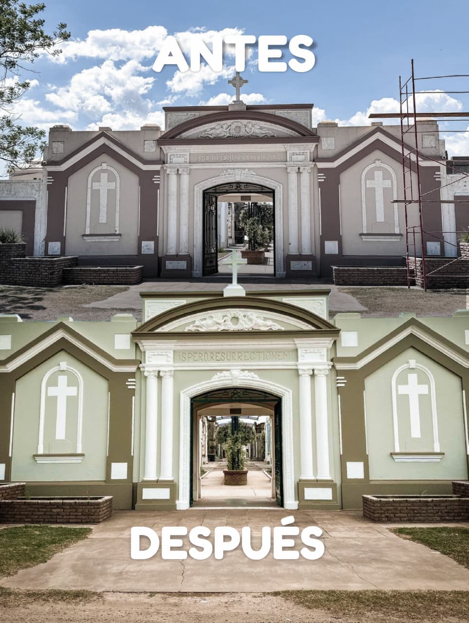 Realizamos la pintura completa de la fachada del Cementerio local, tras un trabajo previo de lavado de paredes para la remoción de hongos y adherencias.