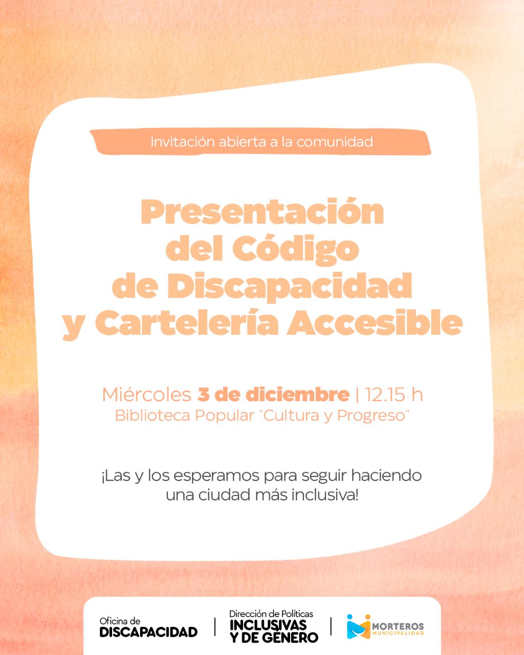 En el marco del Día Internacional de las Personas con Discapacidad, el próximo 3 de diciembre se realizará la presentación oficial del Código de Discapacidad Municipal, un instrumento que orienta las políticas locales de inclusión, accesibilidad y promoción de derechos en la ciudad de Morteros.
