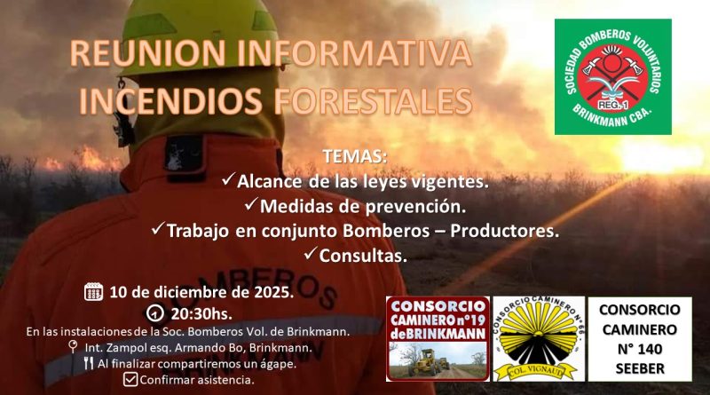 La Sociedad de Bomberos Voluntarios de Brinkmann, junto a los Consorcios Camineros N°19 de Brinkmann, N°66 de Colonia Vignaud y N°140 de Seeber, llevará adelante una reunión informativa sobre incendios forestales.