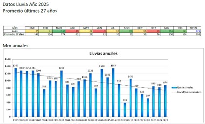 En el detalle mensual de 2025, las lluvias se concentraron principalmente en los meses de marzo (145 mm), agosto (128 mm), noviembre (134 mm) y diciembre (123 mm). En contraste, se registraron meses con precipitaciones muy escasas, como abril (13 mm), junio (9 mm) y octubre (15 mm), lo que refleja una distribución desigual a lo largo del año.