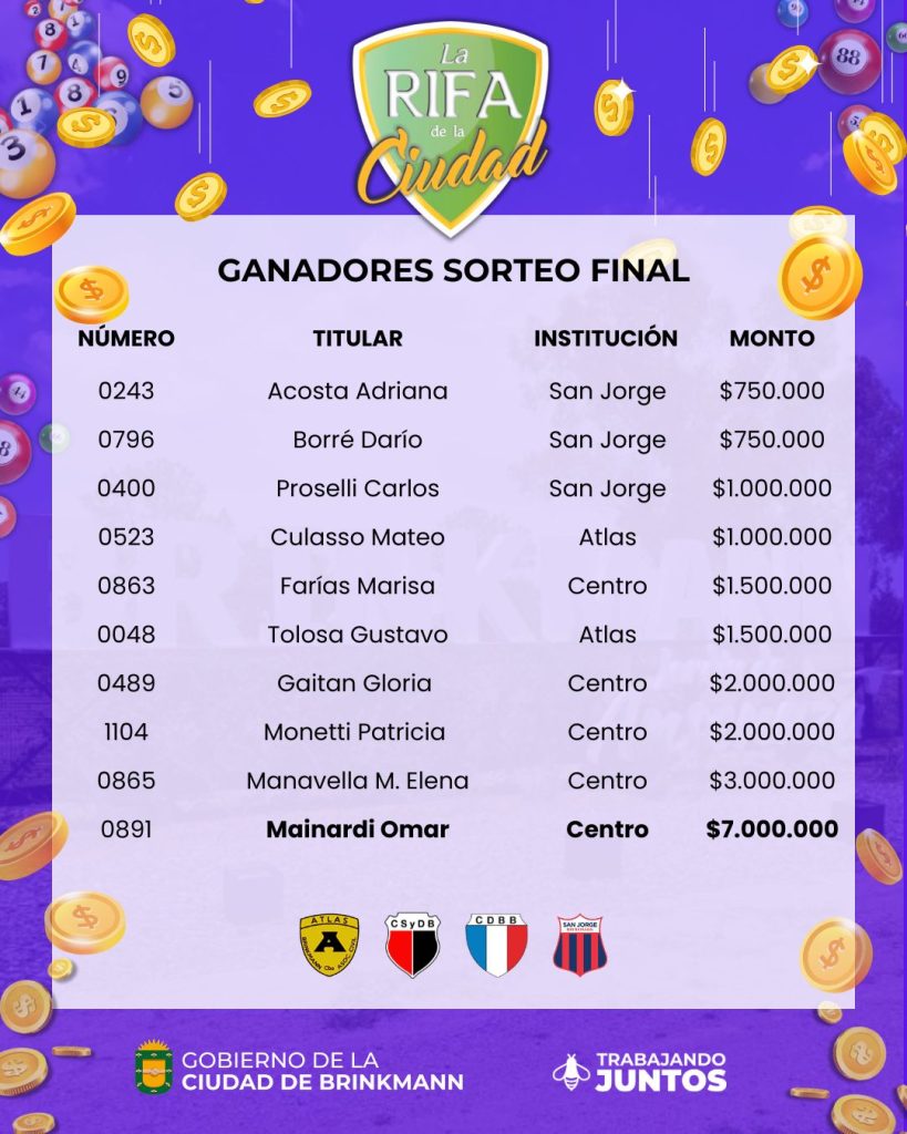 Se realizó en la noche del viernes el sorteo final de la Rifa de la Ciudad 2025, donde Omar Mainardi se llevó el premio principal de 7 millones de pesos. El segundo de 3 millones fue para María Manavela.