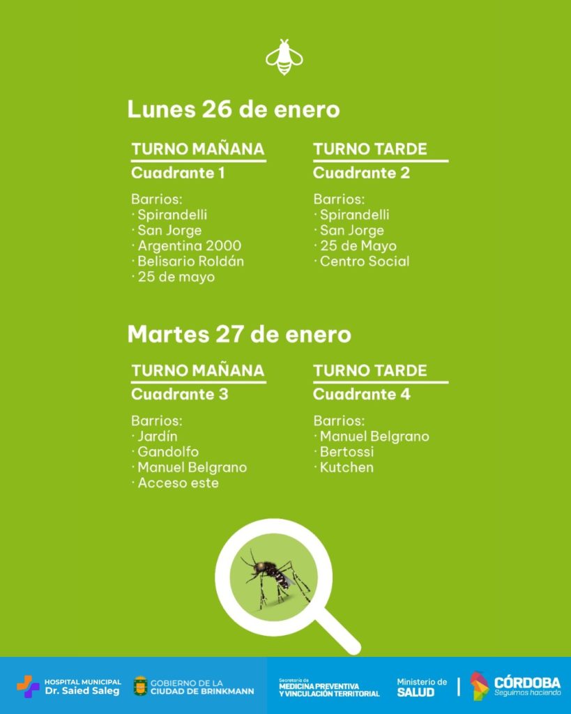 El Departamento de Zoonosis del Ministerio de Salud estará presente este lunes 26 y martes 27 de enero en Brinkmann, en el marco de un proyecto de colocación de larvarios, continuando con la prevención del dengue.