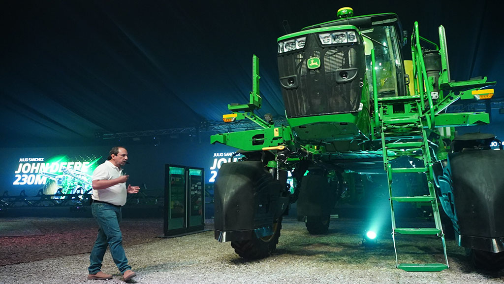 Además, suma el sistema BoomTrac Pro 2 para mantener las barras estables y paralelas al suelo, llenado frontal y la tecnología See & Spray Gen 2, que permite la aplicación selectiva de herbicidas mediante detección “verde sobre verde”. “Los equipos integran motores producidos en Argentina, en la planta de John Deere de Granadero Baigorria”, explicó Sánchez.
